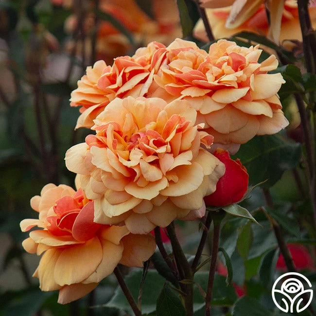 About Face is unique among bi-color roses and his reverse color demands that you stop in your tracks to take a closer look! His petals are dark, bronzy-orange on the outside and light, golden-orange on the inside making it appear as if he is turned inside-out! As the pointed buds open into full, cupped, globular, old-fashioned blooms, the various shades of orange dazzle. About Face has clean, deep green foliage and produces 4” blooms at a dizzying rate. This Grandiflora does well in zones 5-10 and makes an excellent cut flower for arrangements.