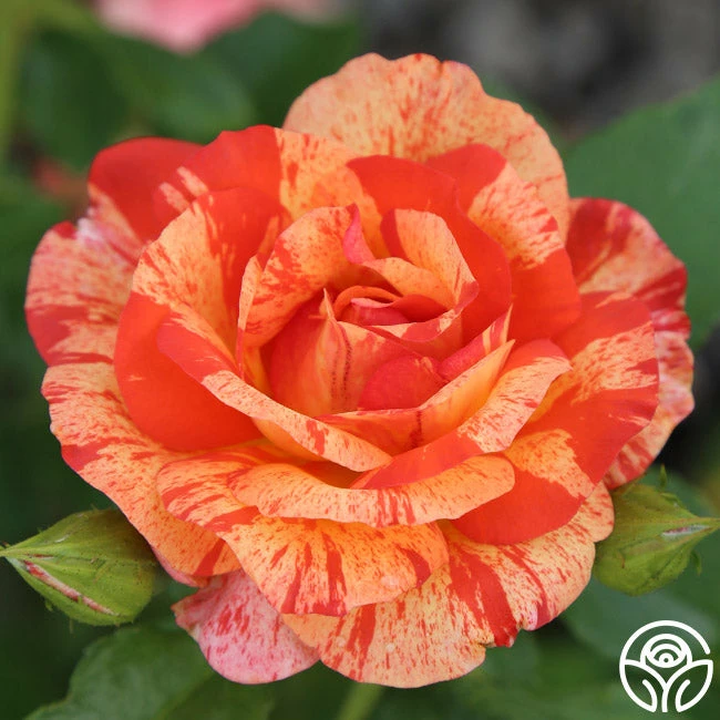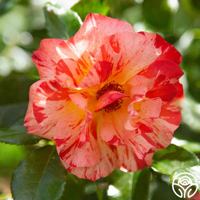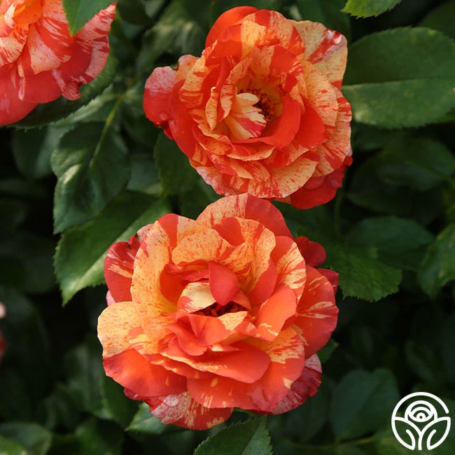 Prepare to be captivated by the striking beauty of Aflred Sisley. Named for the Impressionist landscape painter who was born and spent most of his life in France, Alfred Sisley displays an abundance of glorious burnt salmon/orange flowers splashed with stripes of creamy white. The generous production of large, frilly, and semi-double blooms make a colorful display. Aflred Sisley is a robust and bushy 3′ rose plant that handles the heat well.