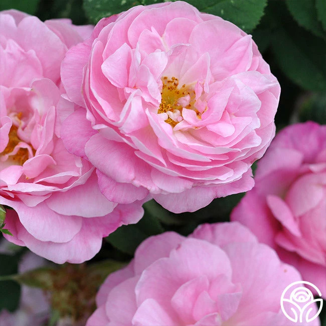 A unique color among old roses with its delicate shade of coral pink. Its slightly cupped, semi-double flowers with golden yellow stamens are borne in clusters on a vigorous, upright bush. The flowers have an exceedingly strong myrrh fragrance. A very old variety found growing in a convent in France.