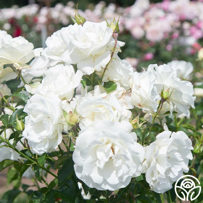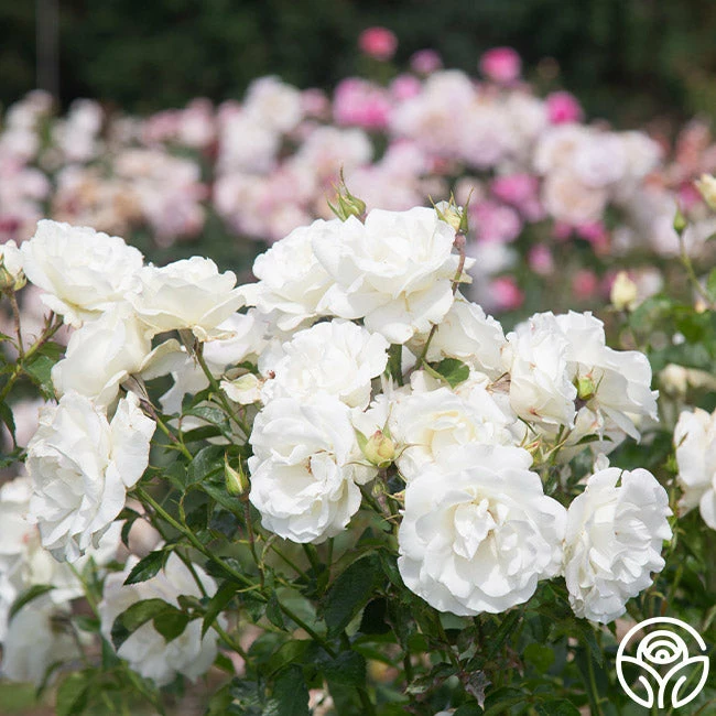 This classic, exhibition-style, pure white, continually blooming Hybrid Tea rose has earned many awards and is known for being one of the best white roses for the garden. Crystalline’s very large, 5.5” blooms emit a spicy and sweet fragrance from her beautiful clusters. Expect her to bloom in flushes throughout the season, performing best in zones 6-10. Watch out for her thorny stems!