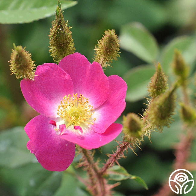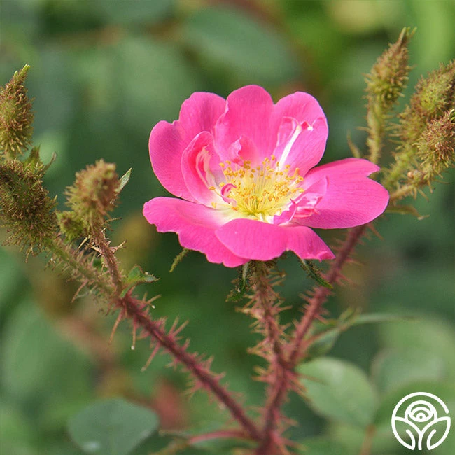 Goethe is a favorite of pollinators producing flowers of very dark crimson to magenta with prominent yellow stamens. His blooms are single to semi-double, open, with a moderate fragrance. Expect numerous prickles with very vigorous growth for this single-blooming rose. Goethe thrives best in zones 5-10.