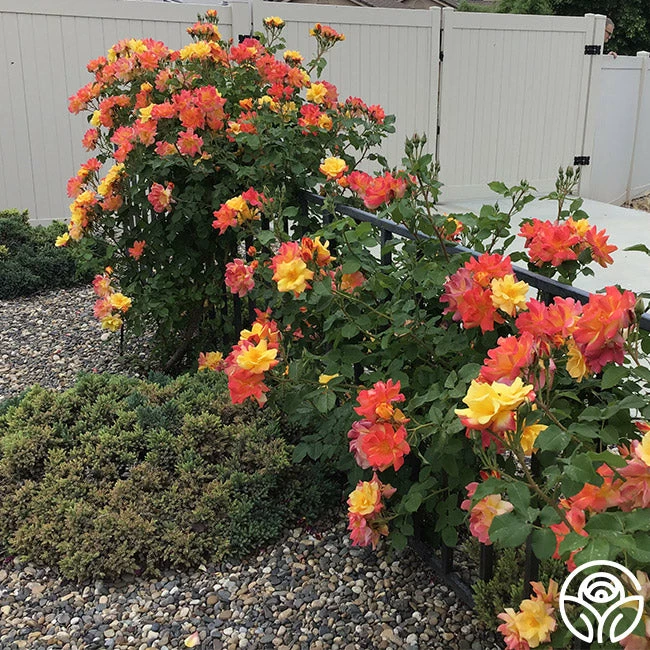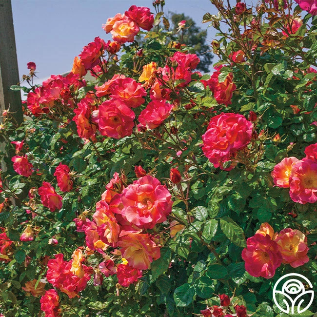 TOP SELLER! This Climber makes a great addition to a cutting garden, and it can be grown as a large climber or as a shrub. Joseph’s Coat produces medium sized, semi-double, 4″ blooms with 12+ petals of cherry-red, deep gold, and orange. He is an upright, hardy, continually blooming plant with dark-green, glossy foliage. Brighten up your garden with the many colors of Joseph’s Coat, and you’ll soon see why he is a top seller!