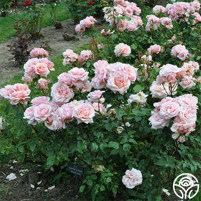 Named the Best Shrub Rose by Birds and Bloom in 2014, Mother of Pearl delights gardeners with her winter hardiness and high resistance to black spot making her ideal for cooler or hot and humid climates. This Grandiflora begins with medium buds that open to display light, pearly-pink blossoms with peachy overtones. Her medium green, semi-glossy, dense foliage is displayed on a tall and upright bush, highlighting her 2.5” medium to large blooms. Mother of Pearl produces small clusters of blooms with one to four flowers per stem with 26-40 petals on each blossom. Her light, refreshing fragrance delicately adorns this plant like a mother’s gentle perfume. Plant en masse for a stunning and prolific display of creamy roses.