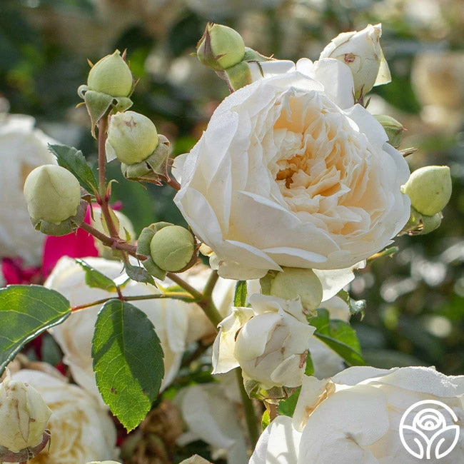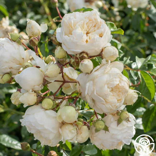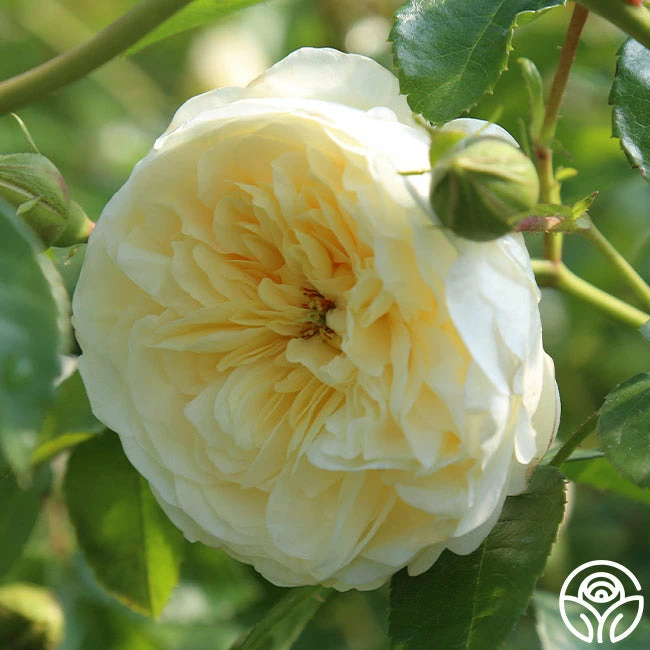 Perpetually Yours likes to show off with blossoms and blossoms of old fashioned 3” flowers in a soft yellow shading growing lighter toward the petal edges. Her flowers cover this continual blooming climbing English Legend rose. Grow her anywhere you please including on pillars, walls, trellises, posts, arbors and fences. Expect her to take off and grow upwards of 10-15’ tall.