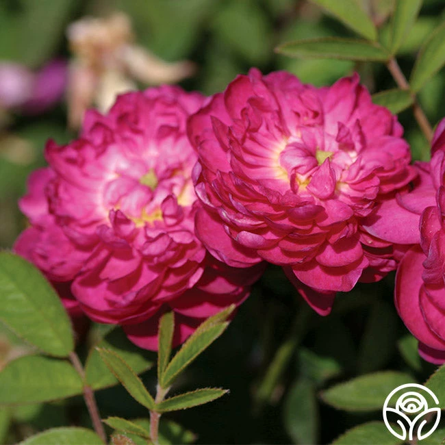 Outstanding in our garden and greatly admired by visitors. Small pompon type 1 1/2″ blooms of pale pink to purple erupt in profusion on a densely foliaged, compact once blooming plant with small foliage. One of the first to bloom in our garden. The blooms spread over the entire bush which itself is of great interest even without blooms. Would be an excellent plant for a small hedge or border, or lovely by the front door or path. Very even growth. Lower canes are never visible. Good for small gardens and tubs.
