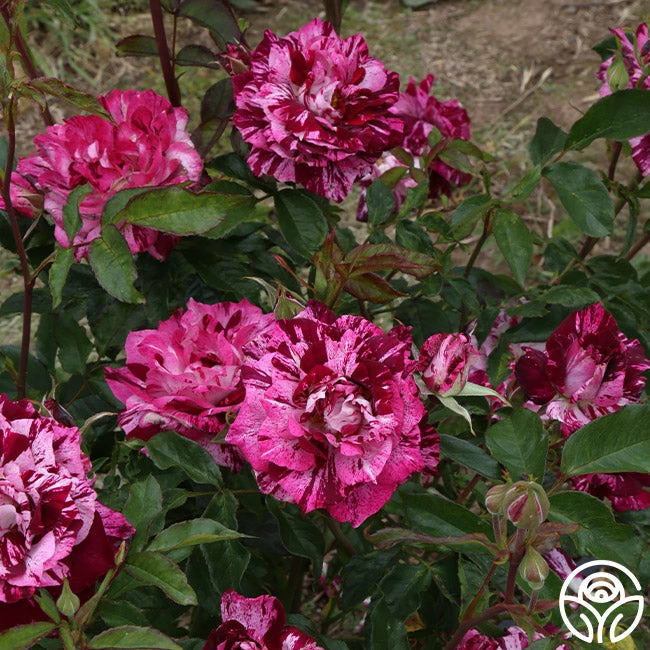 TOP SELLER! Prepare to be stunned by the unique splash of Purple Tiger. Each unique bloom and petal seems to explode in a colorful rhythm of slashes, dashes, streaks, and dots as if splattered on by an artist. A citrus-sweet perfume and minimal thorns are an added bonus! Any lover of purple roses must add this rose to their collection.