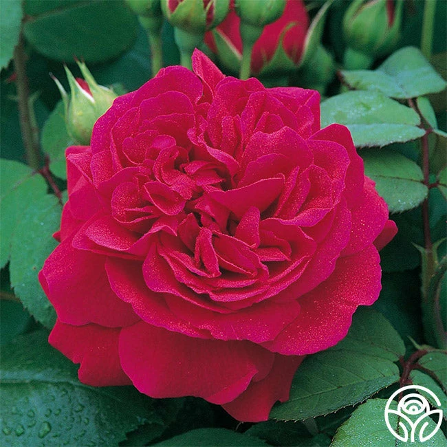 Named for the Thomas Hardy novel, Tess of the d’Urbervilles features large, fragrant, 4″ flowers with 70+ petals in a bright crimson color. Her blooms have a nice, deeply curved shape in the early stages, and then her petals turn back to a less formal flower. Tess’ blooms are hefty and usually bend over, giving an elegant, cascading effect to the bush. Her growth is robust and spreads against large, dark green foliage. We love Tess’ old rose and fruity-myrrh fragrance and that she is a generous, repeat bloomer. She can handle partial shade or pots and makes an excellent Climber.